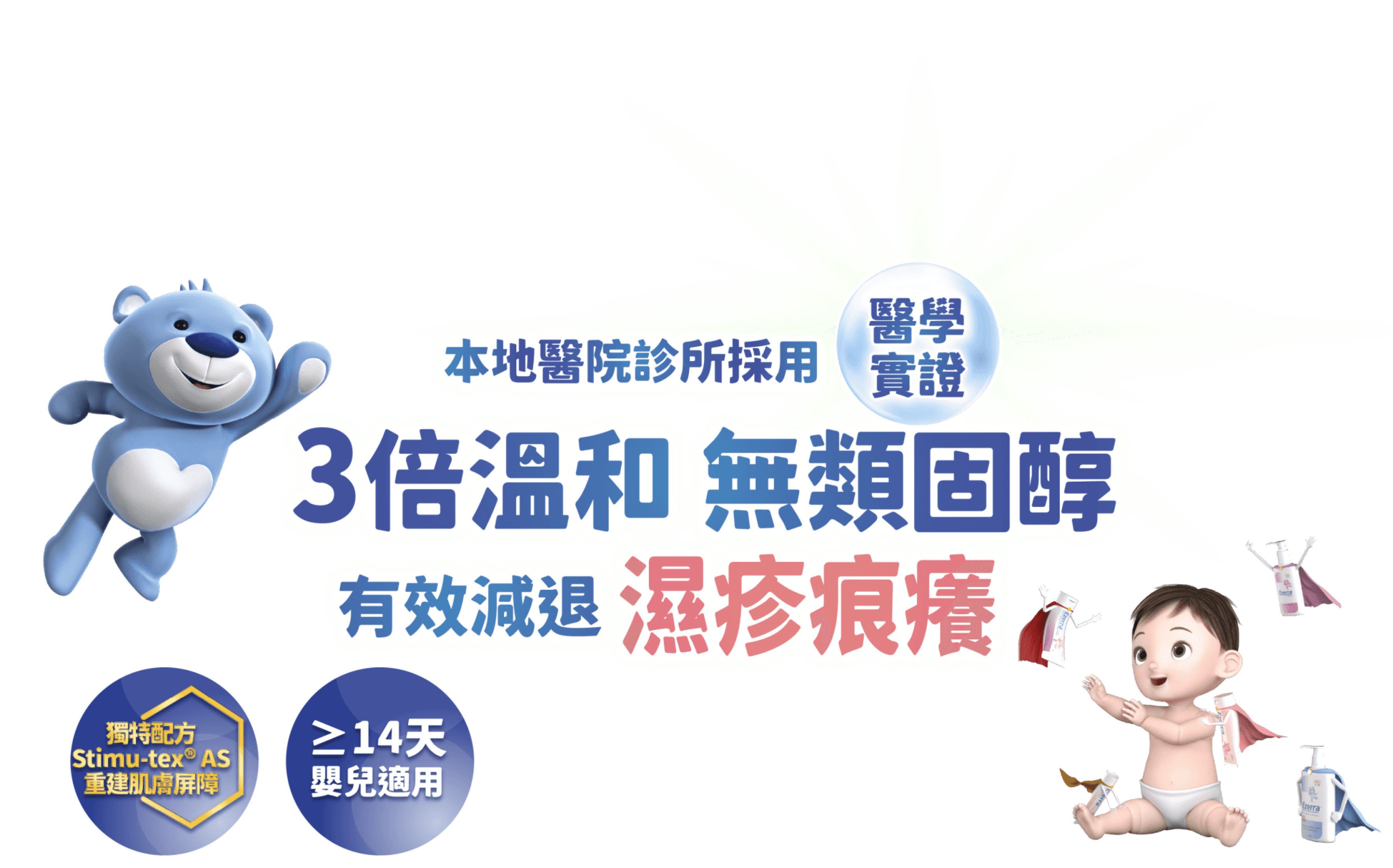 - Stimutex-AS:天然濕敏配方,快速止痕退紅,持續修護濕疹或敏感肌膚,減少復發機會